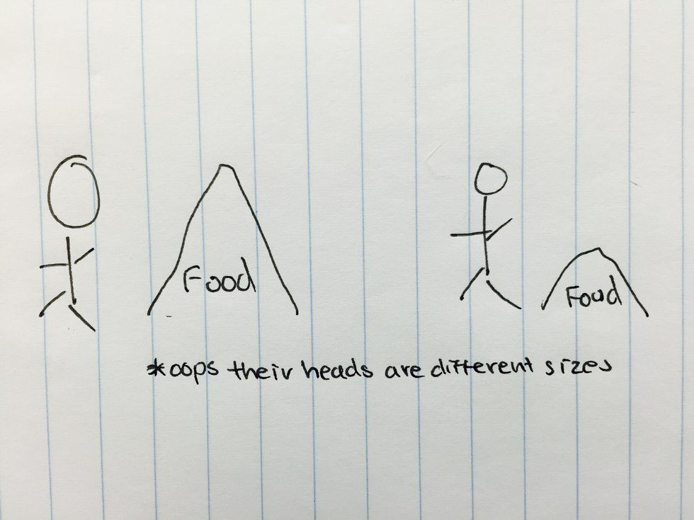 What do you expect their plates to look like? Under logical circumstances, one might suppose that the man on the left would have ten overwhelmingly full plates of food versus the man on the right, with his ordinary plate.
