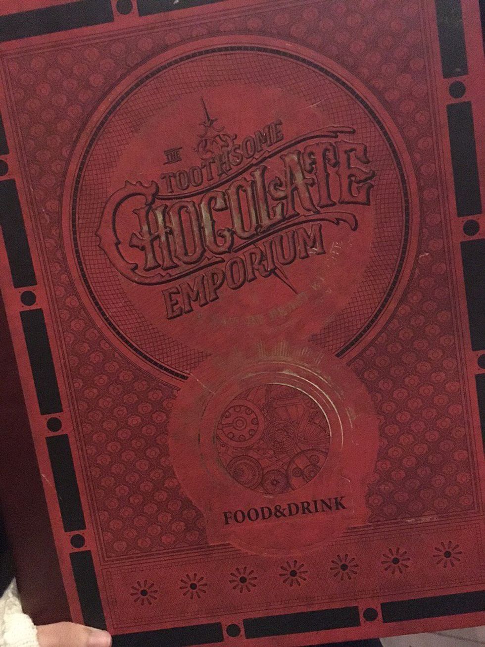 Upon being seated, you are given a huge Victorian style book that is the menu. The first page is the story of Professor Doctor Penelope Tibeaux-Tinker Toothsome and how the Emporium came to be. This is the first restaurant at Universal Orlando that has an elaborate story and character. Penelope herself may even stop by your table to welcome you to her Emporium.
