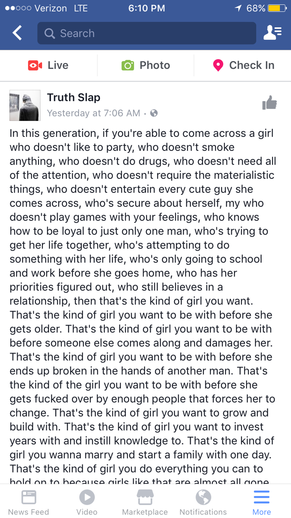 Image aside though, let's really dive into things. The very first sentence is a run on which bashes the life decisions of women who chose to live their lives in ways that they want to. Not only is it gender exclusive, but it shames women. The post makes it clear that, God forbid, if a girl chooses to have a good time partying, smoking anything, choosing to do drugs, or wanting a little attention it means that she isn't the one. You are a product of the trash this generation has come up with. You are not worthy of love or attention and you are sure as hell not worthy of a good man. The quote talks about how if you choose to have a social life outside of going to school and going to work you are unworthy. You are not a diamond in the rough; you choosing to have a life outside of work and school is a selfish decision and living for yourself is simply not acceptable.