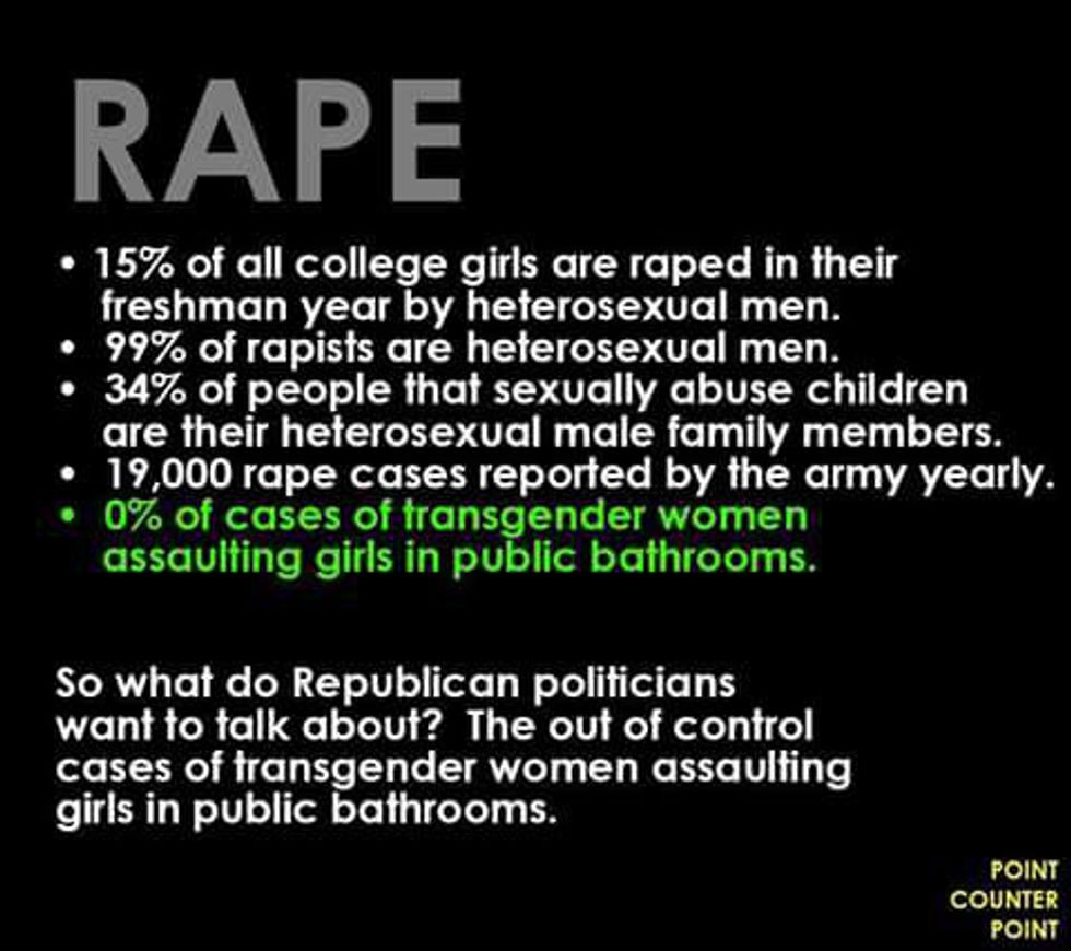 Fact: There is a higher chance you are raising a straight male who will go off to college and rape and/or sexually assault someone than you raising a transgender person, let alone one that will be a rapist.