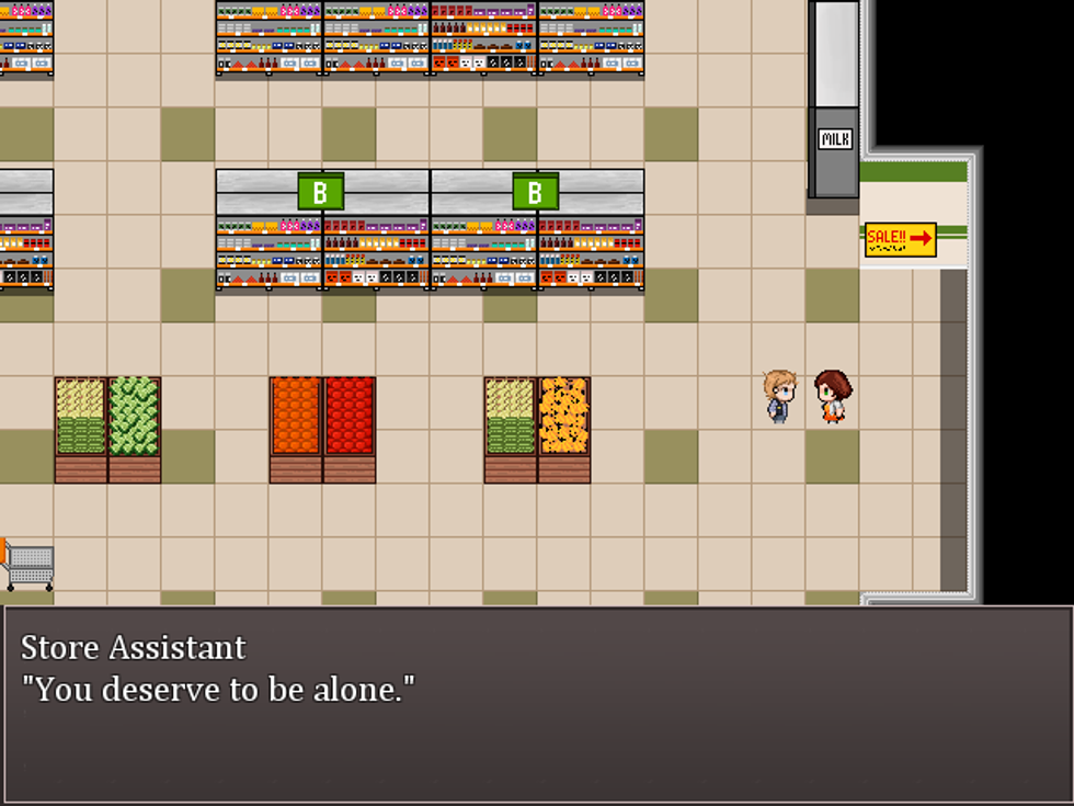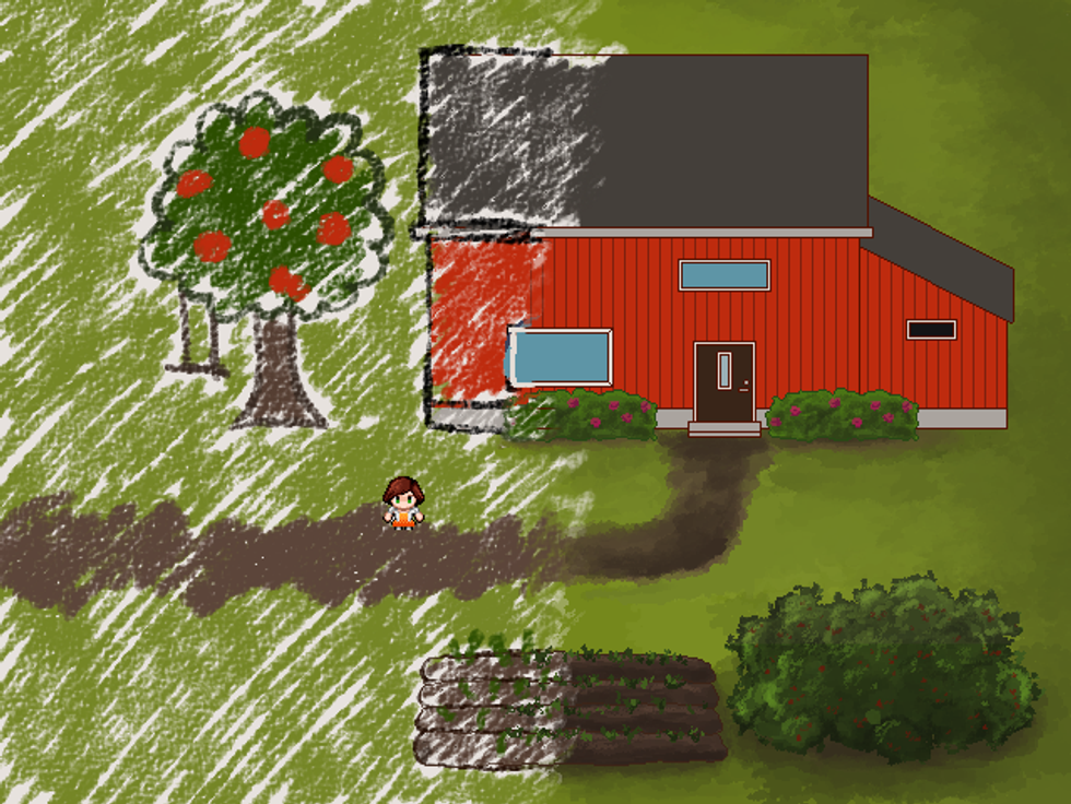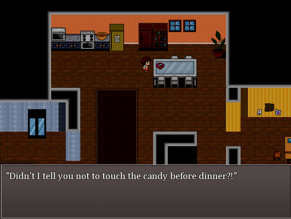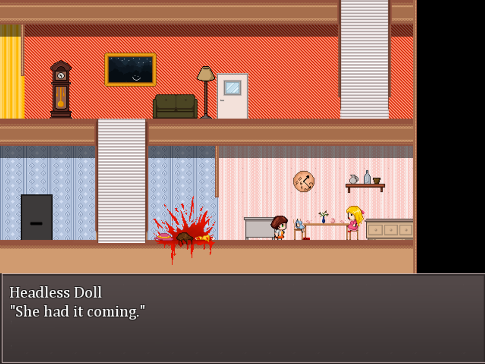 But nope! You find a rusty key inside, then the dog immediately attacks you with a one-hit death. I find out eventually after some backtracking through a couple maps that I had to find a bone underneath a bed. Bed, bone... Those two have nothing to do with one another. Exploration is key in many RPG games, but this game punishes you with immediate death if you don't explore in the right order.There's also gameplay elements that appear to not exist for challenge or fun, but just to prolong the running time. A naked doll will ask you to get her an outfit as a fetch quest, and you eventually find a closet filled with three dresses. You can only carry one at a time, so you take one out and show it to her, only for her to tell you that you didn't pick the correct colour. She'll just ask you to get another one, but she never tells you which colour she wants. So you just go back and forth till she decides the one you picked was pretty enough. That's not fun. It's boring and annoying.