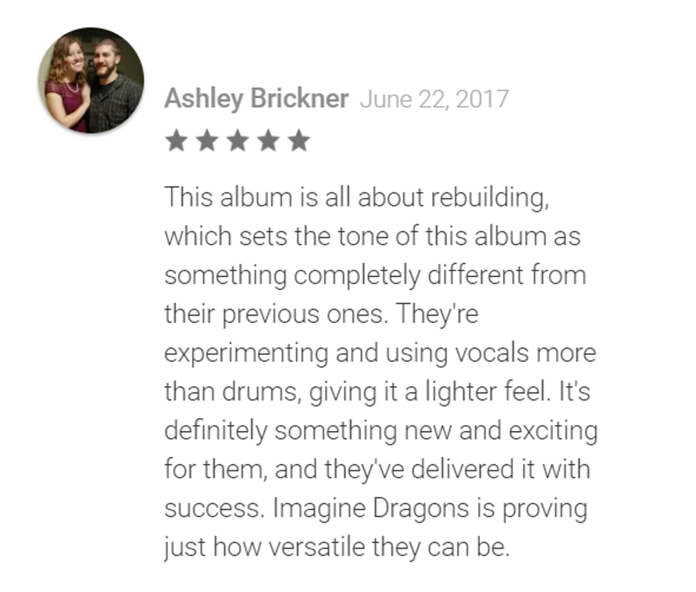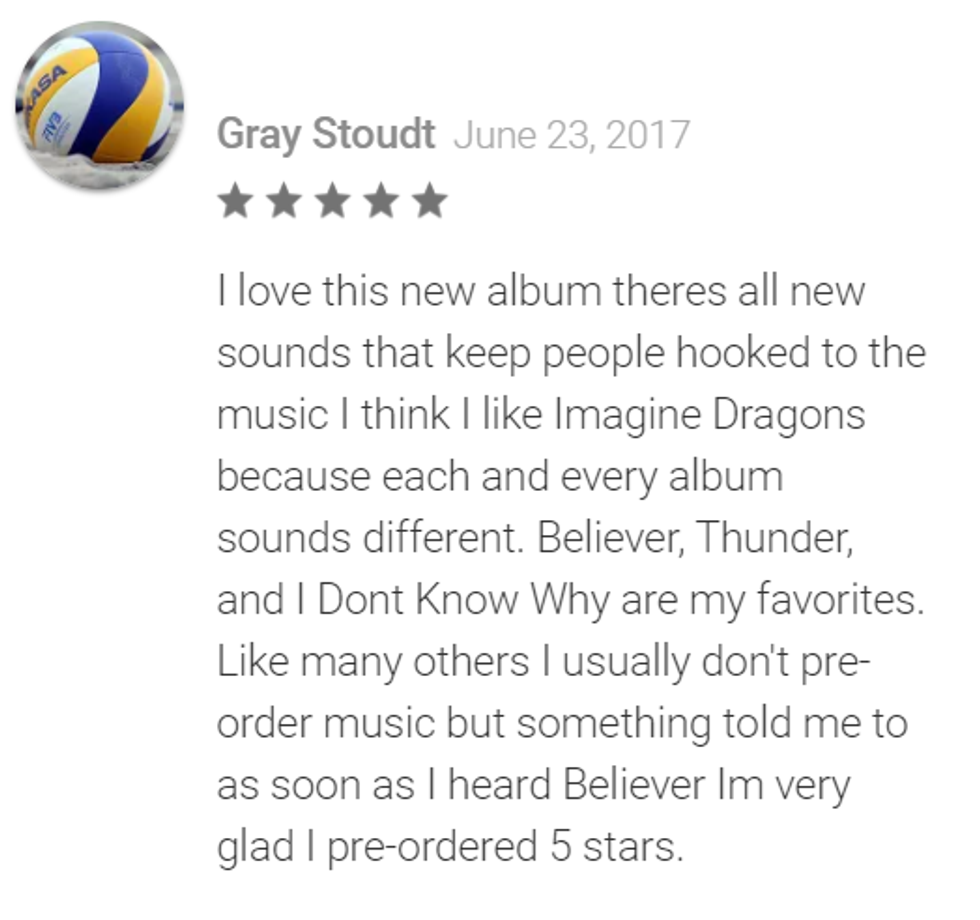 Thankfully, one thing that hasn't changed is the passionate and powerful vocals of lead singer Dan Reynolds. Reynolds' talent is highlighted in all eleven songs, especially "Believer."