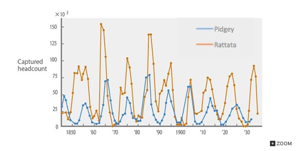 Population fluctuations are inevitable in a healthy ecosystem. But how will the 2-3 ºC temperature increase affect its delicate balance? Mirroring the lynx-snowshoe hare cycle, Pidgey and Rattata populations grow and drop inversely to one another. Because Rattata are a Pidgey's favorite meal, continued predation due to high Pidgey population induces a population decline in Rattata. The Pidgey decline follows the Rattata population crash, and so on. Unusually high populations of both species currently exist. This may be because Pidgeys have turned to the more easily accessible Weedle, which thrives on forest succession.