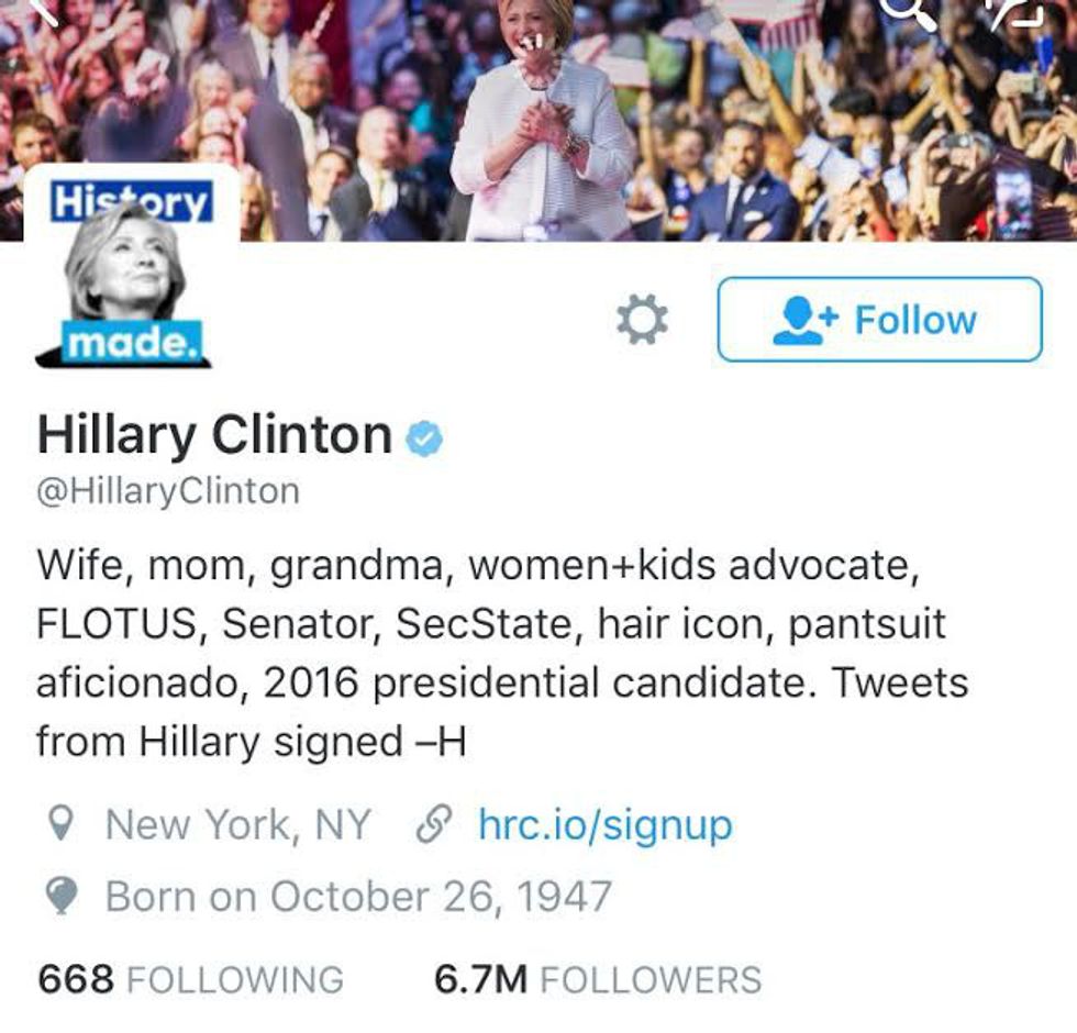 I'll be honest, the first time I actually saw her Twitter bio, it made me laugh from "hair icon" to "pantsuit aficionado."
