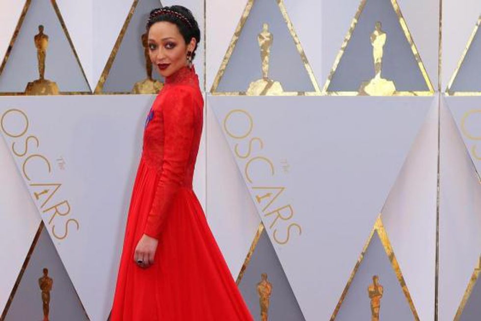 Ruth Negga, a 2017 Best Actress nominee, wowed on the red carpet in a custom Valentino dress. She accessorized with beautiful jewelry and made a statement with a blue American Civil Liberties Union ribbon.