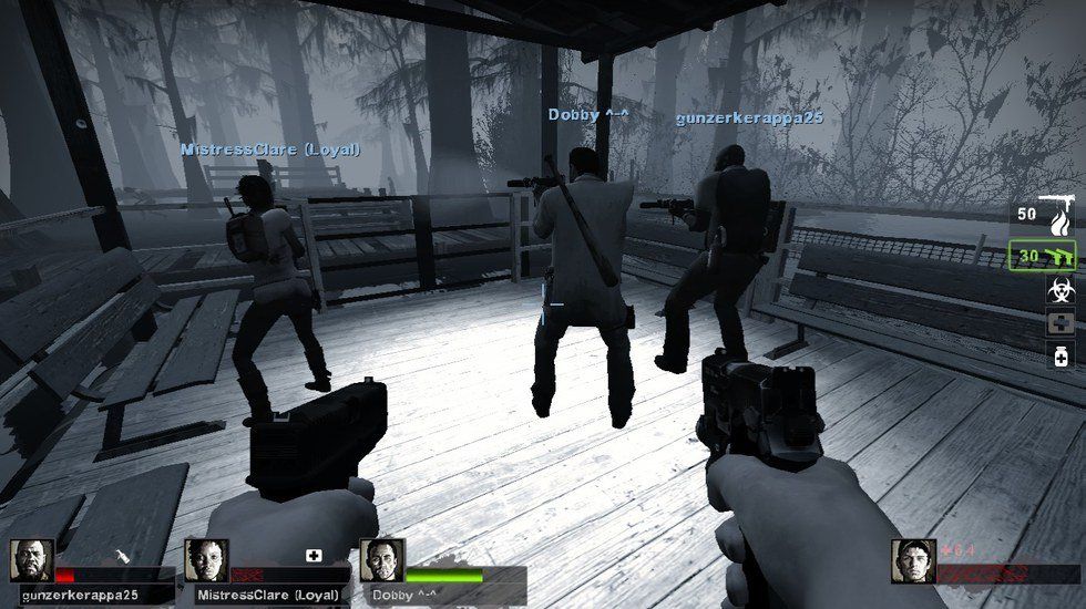 As a carrier, I choose not to use up my ammo or ammunition. Since the pistols in the game have unlimited ammo, I choose to use those instead of my primary weapon. The primary weapon is best used for the special infected, in this case. To put it into perspective, imagine a team of four, you being among the four and your friends as the other three. Not too far into the first part of the campaign, a horde of zombies already attack, special infected start spawning in the most random places and everyone's health is suddenly down to 75% or less; the worst part is that this is just on normal mode. Your health, however, is still a full bright green. Being the good Samaritan that you are, you go ahead of the group to clear the way. When things don't go as planned and your character gets jumped by a special infected zombie(s), your health suddenly drops from the high 90s to low 30s, maybe even less. There's no point in healing at this point, not by much anyway.