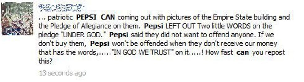 In recent weeks, social media has been in uproar over the infamous “patriotic Pepsi can” and supposed omission of “under God” in its printed Pledge of Allegiance. The call was made for American Christians to essentially boycott Pepsi in order to let our offended voices be heard. This message circulated through emails, Facebook statuses, tweets, and text messages. (No, chain messages are not dead. Share this article or you will have seven years of bad luck.) This hoax dates back to before 2011, resurfaced again in 2013, and again on my Timeline last week. Now, as many of you know, this rumor is just that: a rumor. But, it did seem to light a few sparks, one of which just so happened to make its way to me.