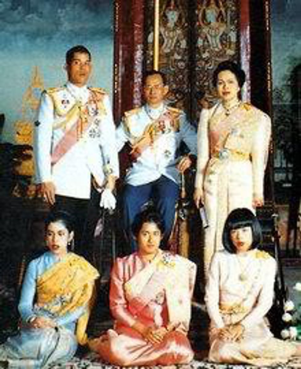 King Bhumibol Adlyadej and his wife Mom Rajawongse Sirikit Kitiyakara and four children. Princess Ubolratana Rajakanya, Crown Prince Maha Vajiralongkorn, HRH Princess Maha Chakri Sirindhorn, and HRH Princess Chulabhorn Walailak.