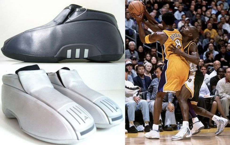 The sleek design of the Kobe Two really displayed Audi’s role in inspiring the sneaker. Seamless construction with a signature Adidas shell toe made these sneakers one of the heaviest pairs at the time. However, the Kobe logo on the back of the heel adds a nice touch by displaying the silhouette of the black mamba's head and vintage afro. Also, apparently if you buy these shoes, you can dunk from behind the free throw line.