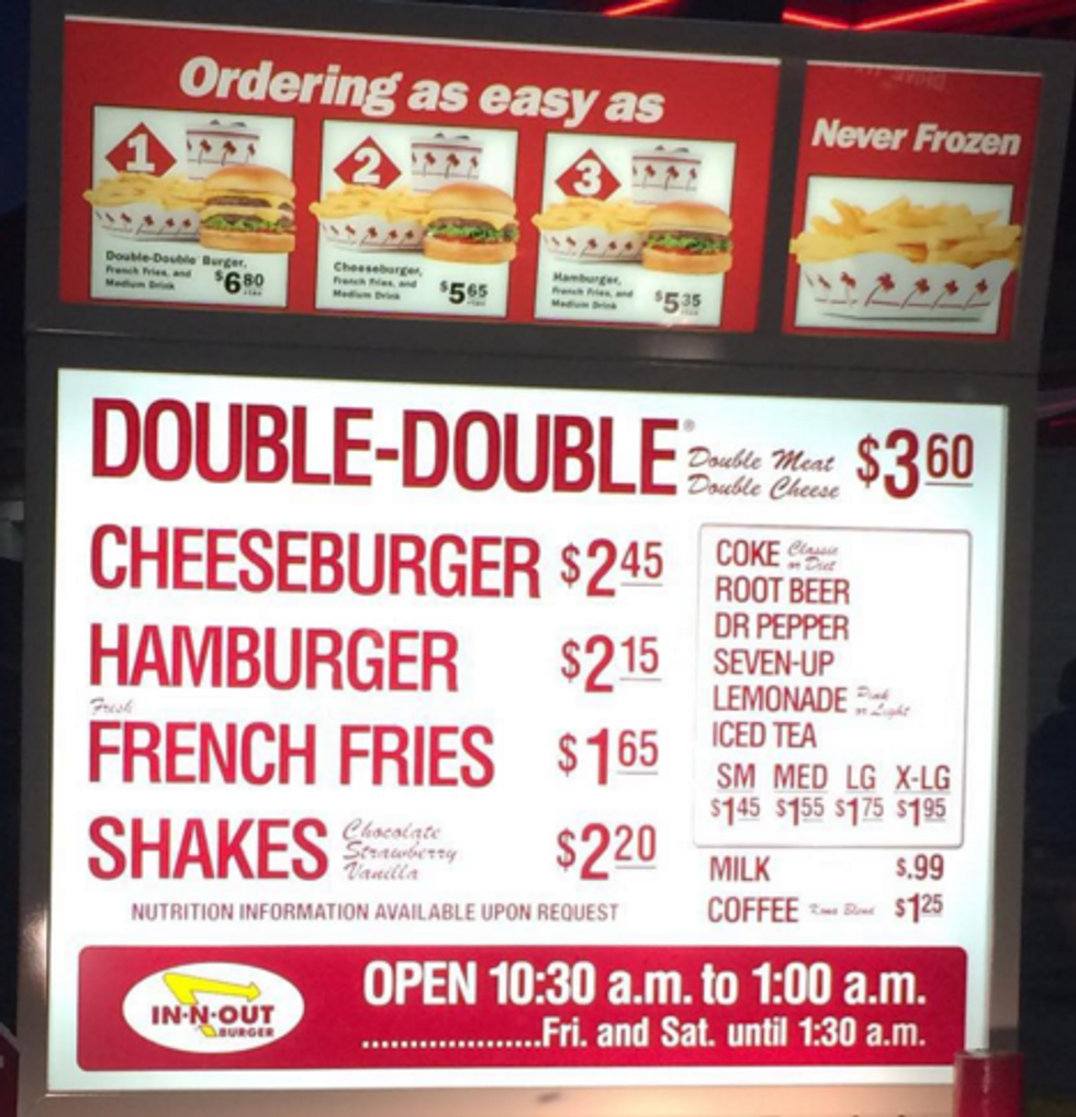 The menu is SO SIMPLE, but it works! You have your standard hamburger, cheeseburger, fries, and drinks. If you want something a little more crazy, have no fear, because In-N-Out has a secret menu which involves ANIMAL STYLE FRIES…need I say more? It’s so easy to order which makes it easy on large groups and for those who can’t simply make up their mind.