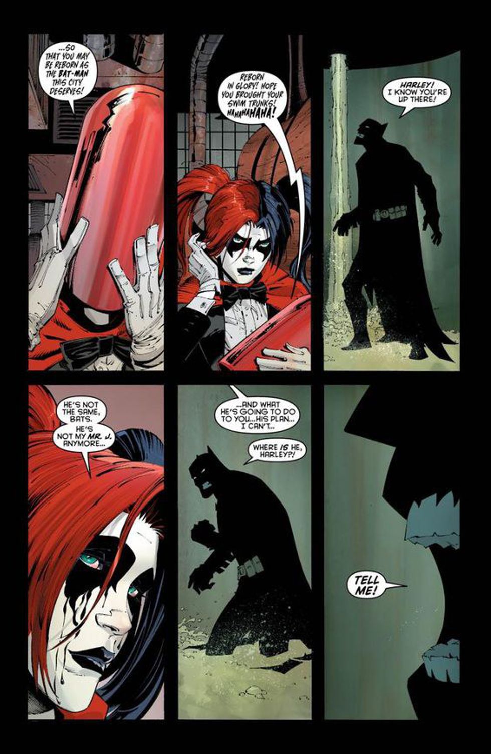 Fast forward to 2012 to the comic titled Death of the Family. In this comic, the Joker is planning to take down Batman’s super hero family once and for all. Although this issue only features Harley Quinn briefly, I felt it worthy to mention as we can see how abused and broken she is from the Joker. At one point, the Joker lures the Batman to the place where he fell into toxic chemicals and was “reborn” as the psychotic killer. Batman meets him at this location and the Joker dawns his original costume from when he was The Red Hood. The costume is a tuxedo, a cape, and a read “helmet” that completely covers the cape. After a brief fight, we discover that the person wearing the suit is actually Harley Quinn who has been instructed by the Joker to distract Batman. Batman questions Harley Quinn about where the Joker is and we clearly see how much she fears for her life. She reluctantly tells Batman and cries, realizing that the Joker will probably “punish” her later.