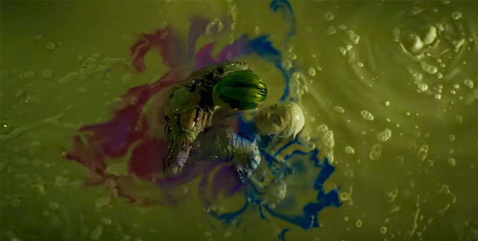 Joker jumps in to toxic chemicals to revive Harley Quinn in the Suicide Squad movie (Warner Brow 2016).