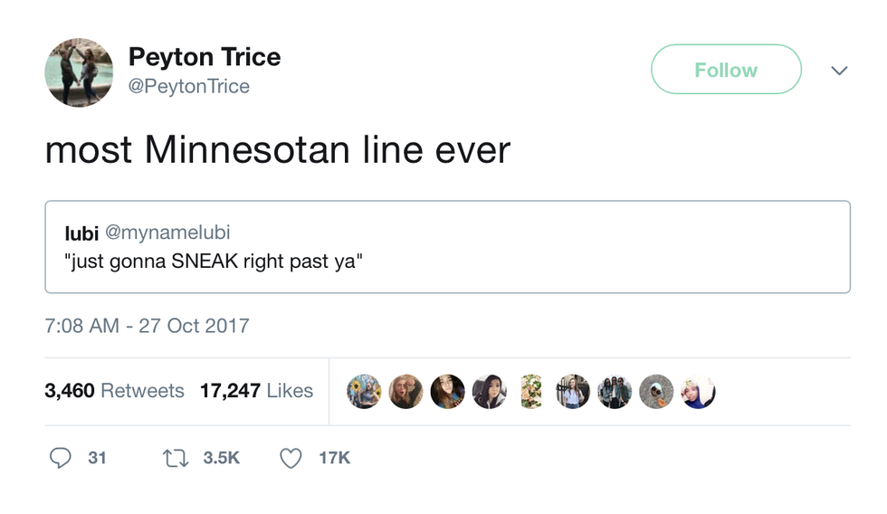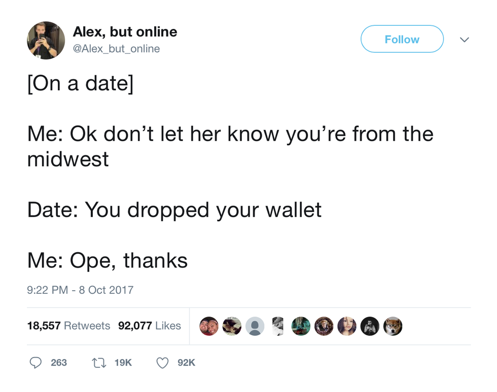 This HAS to be the first quirk because it is a crucial part of the Midwestern vocabulary. The word, "ope" is basically a word that is used when someone startles you or a mistake happens. To use it in a sentence, "Ope, I'm so sorry" after you ran into someone on accident. This quirk is something that I honestly didn't even realize I did until it kinda became a meme on Twitter. The tweet was originally posted by @Alex_but_online, then spread like wildfire. Now, as a Midwesterner who uses this word religiously, I am very conscious of it everytime I say it.