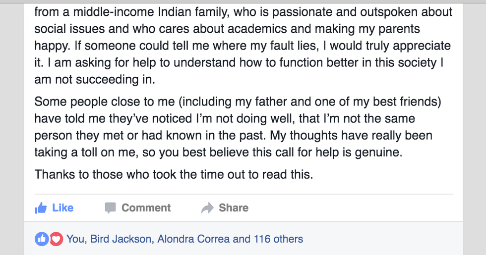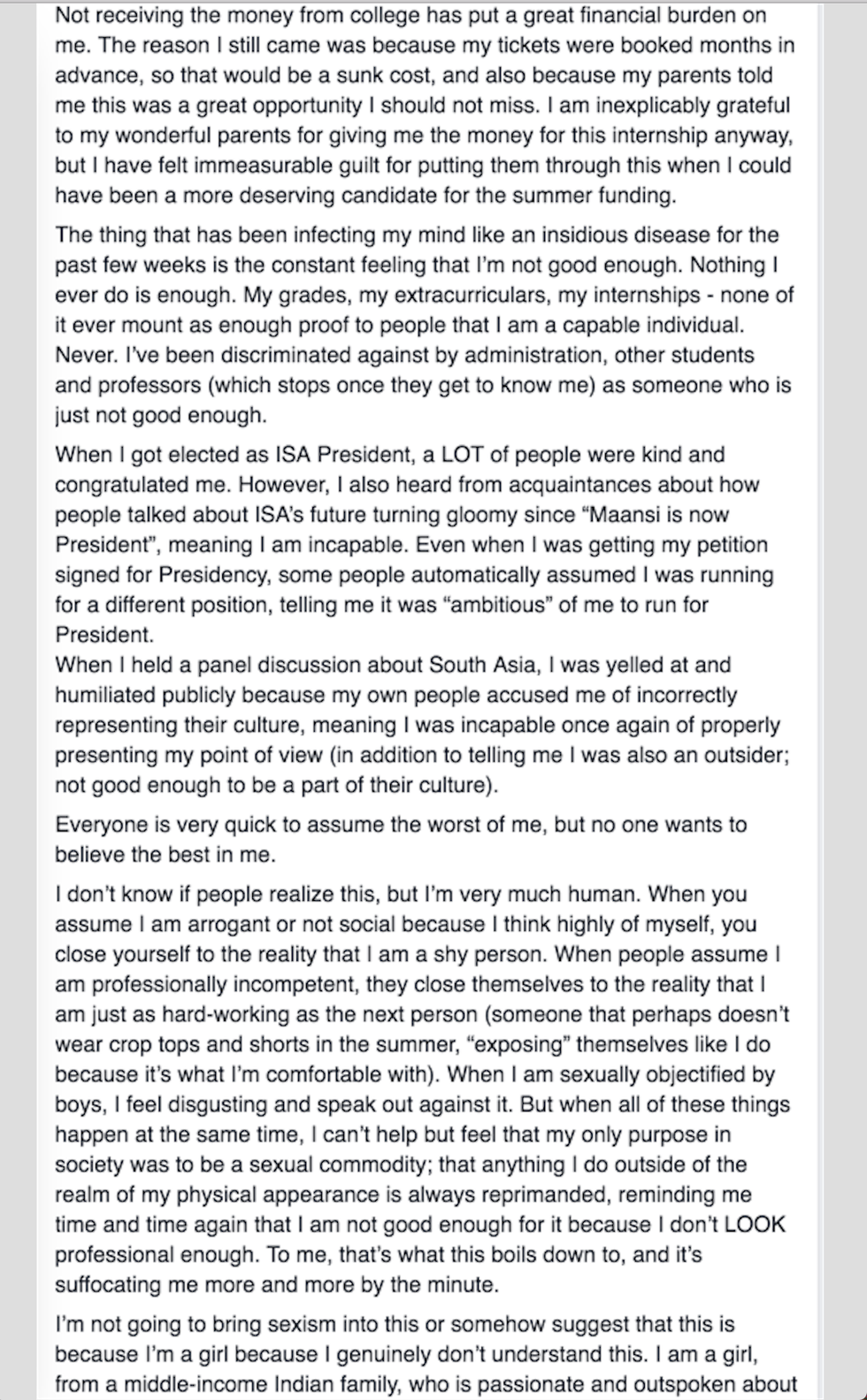I have attached Maansi’s original Facebook status so that we are reminded that we are all in this together and we can’t forget that just because someone is put together on the exterior doesn’t mean everything is functioning perfectly in the interior. We are all human beings, and we are growing up a lot faster than we imagined, so let’s help each other and be there for one another. This time in our lives is stressful and messy and we need every ounce of guidance and love as possible.