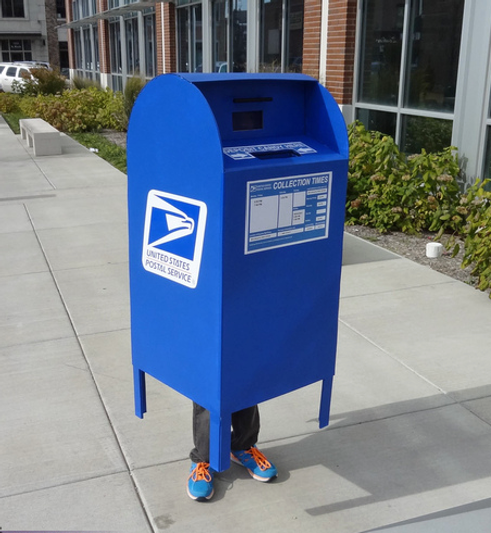 I'm a little concerned for this person's visibility in this costume, but overall a solid effort. Also bonus points for color-coordinating the shoes with the metal color of the mailbox.