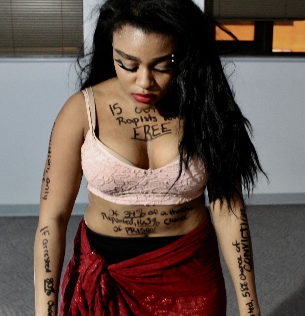 A short dance piece set to Imogen Heap's song Hide and Seek. Focusing on the low incarceration rates for sexual assualt cases. The dancers body is decorated with statistics as you watch her fight the constant battle with the media and against rape culture to be seen as more then just a body to abuse. Eventually ending with her death a figurative ending to the never ending battle for justice in cases of this magnitude. Co-Creater with fellow Odyssey writer, Yasmeen Ashour and dancer Akeelah "Bizzare" Metlock for our final projects. The statistics are as follows:
