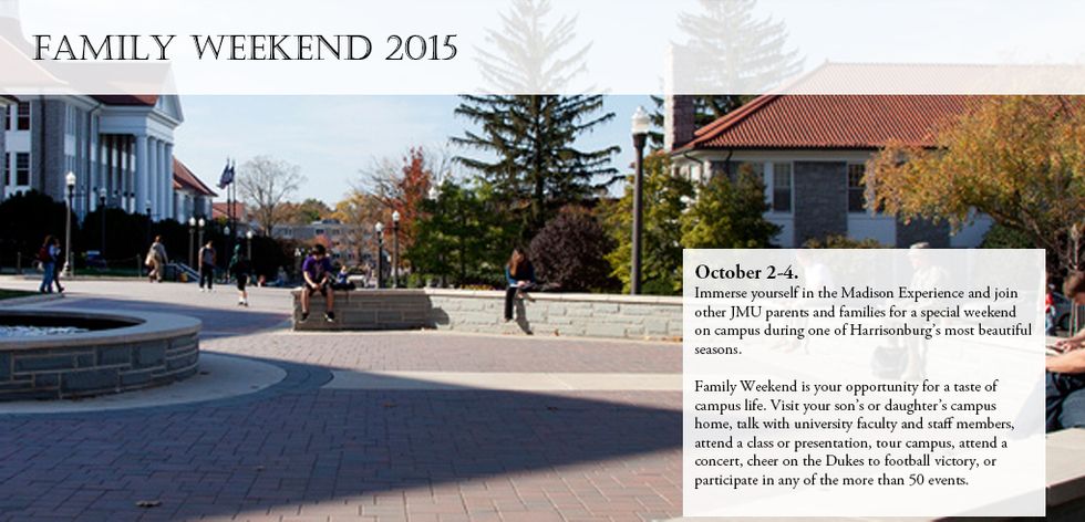 Going to college is an exciting and nerve wracking experience for the whole family. No matter how much your little brother or sister will hate to admit, they are going to miss you! Your parents are going to be worried about you getting enough sleep, nutritious food, etc. James Madison University makes sure the incoming freshman's parents get an equally warm welcome. The Office of Parent Relations even assembled the Madison Family Handbook to guide them through the next four years. Additionally, there is a family weekend in October where there are opportunities to parents to spend quality time with their kids.