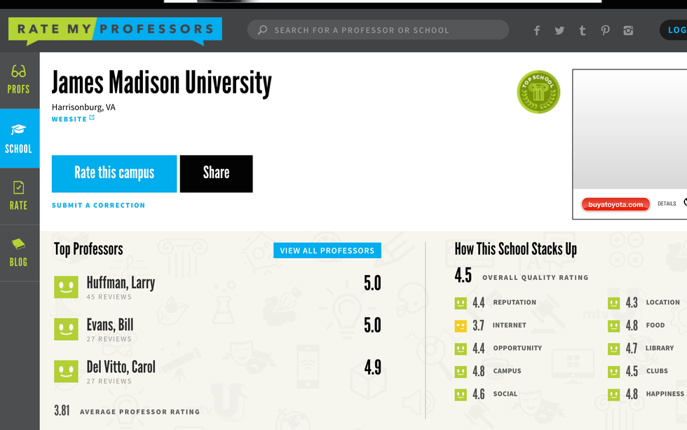 There is not one professor, yet, that I haven't enjoyed. As you can see, according to Rate My Professor, our school has quite a high reputation. Having an overall quality ratings of 4.5, our lowest being 3.7 for internet, we clearly are doing well. Our students were rated at 4.8 for overall happiness. Funny enough, Rate My Professor created a list of the hottest professors for 2013-2014. David B. Daniel, Professor in the Psychology department at James Madison, got number one on the list!