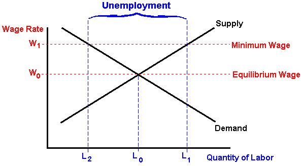 Presidential candidates such as Bernie Sanders argue that the minimum wage should be increased to 15 dollars an hour. They argue that this would be a wage on which working families could live, and the increase in income would increase consumer spending and investment, which would increase aggregate demand, which would ultimately help the economy. But, something politicians (such as Bernie Sanders) often overlook, is that the laws of supply and demand cannot be repealed. They are a part of the human condition as a result of trade. The minimum wage is a price floor (government-imposed limit on how low prices can go). So, when a price floor is enforced, the supply is greater than the demand for the good, causing a surplus. The size of the surplus depends on how high the price control is above the equilibrium price. In other words, according to economic law, a minimum wage set above the equilibrium wage will cause the supply of labor to be greater than the demand for it, resulting in unemployment. As the minimum wage rises further from the equilibrium, the number of unemployed continues to increase.