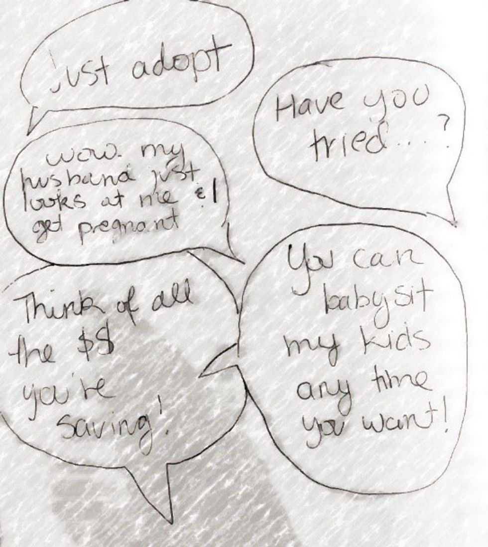 But it needs to be. Women, men, families, mothers, fathers, couples-everyone needs to hear about it, talk about, and feel comfortable when it’s brought up. They need to know how to appropriately respond when someone confides in them that they are struggling with infertility. It’s hard enough to be left in the dark with this disease. Yet society forces us back into the emptiness every time we are questioned about our lack of offspring. It doesn’t matter what we say, because inevitably, one of the following ignorant responses will be thrown back at us: