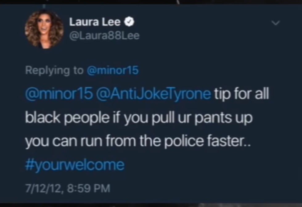 With Laura, she had more obvious racist tweets, even ones that told men of color to pull up their pants so that they could "run from the police faster." Nikita's were mostly distasteful, talking about how some children deserved to be abused.