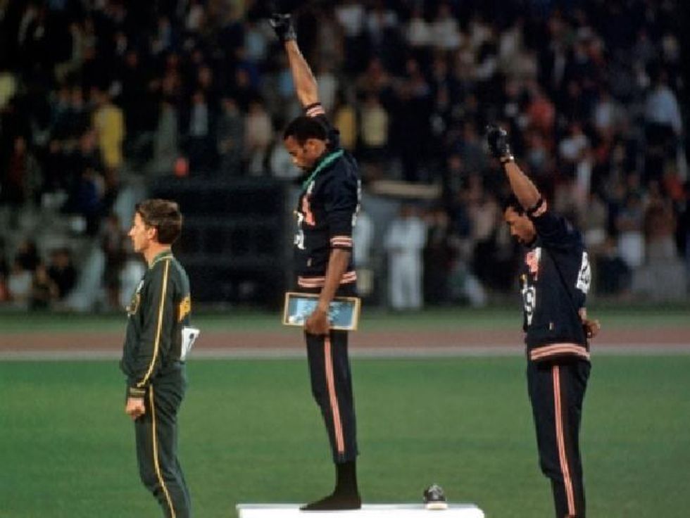 At the 1968 Summer Olympics, hosted in Mexico City, Mexico, the medal ceremony for the 200 meter sprint, first place winner, Tommy Smith and second place winner, John Carlos, posed for pictures in what is now one of the most iconic poses in sports history to date. The two stood with one hand in the air covered with a black leather glove with their heads down while wearing no shoes and Olympic Project for Human Rights badges(OPHR). The black leather gloves, head bow and fist in the air became an "infamous" salute for members of the 1960's Black Panthers Party whose motives were to promote empowerment and equality within African American communities across the U.S. The two chose to wear no shoes to represent poverty stricken Blacks of America and the OPHR badges protested against segregation across the globe.