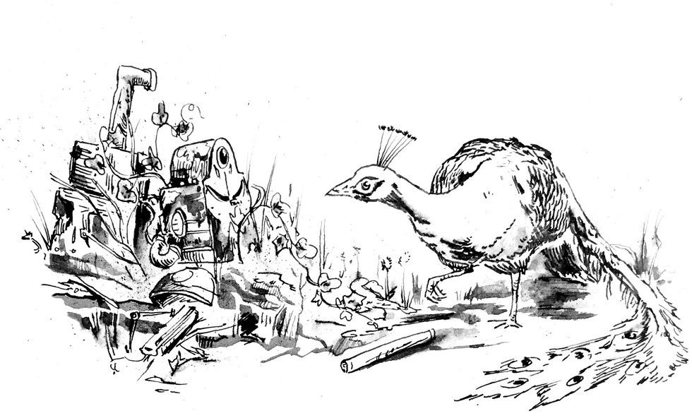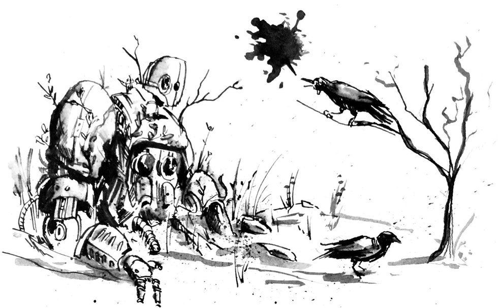 For the next month, I'll be posting a drawing featuring a bird at the site of a decaying robot, for a total of 31 drawing all following this theme. The proud work of some inventor has in a sense, died, and is now under the apathetic gaze of a bird, the very symbol of fleetingness. I often start with a theme and then find inspiration, which might sound backwards. I think of it as discovering the inspiration my subconscious knew all along. Had you asked me at the beginning of this journey why I chose to draw birds and dead robots, I couldn't tell you. Now, however, I think I can shed some light on the matter.