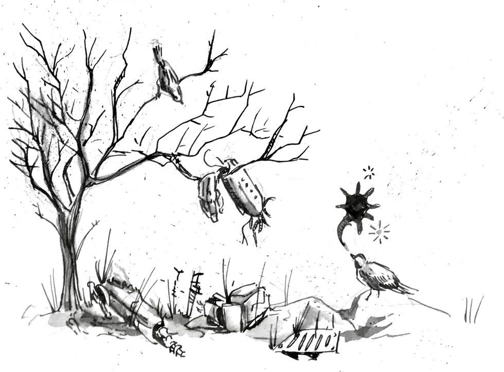 A drawing invoking post-glory day imagery conjures up feelings of wistfulness and nostalgia. However, the birds contain within them the simple truth that beauty does exist, even if fleeting. If God appreciates that which does not last, then our response to death cannot be wrapped up in submitting to overwhelming futility.