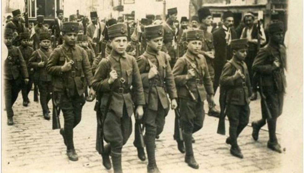 For those who don't know, Battle of Gallipoli was a campaign of World War I that took place in the Ottoman Empire (modern Turkey). In Turkey, it is regarded as a defining moment in the nation's history, perhaps the last great victory of the Ottoman Empire. Victory required sacrifices of every member of the nation, including children. And those children on the photo who were aged 15 to 16 also took part in the battle. If you could hold a gun, you were old enough to fight in the war. Their bravery was eternalized with a song ("Hey 15'li") but their youth was stolen.(TRT Haber, 2013)