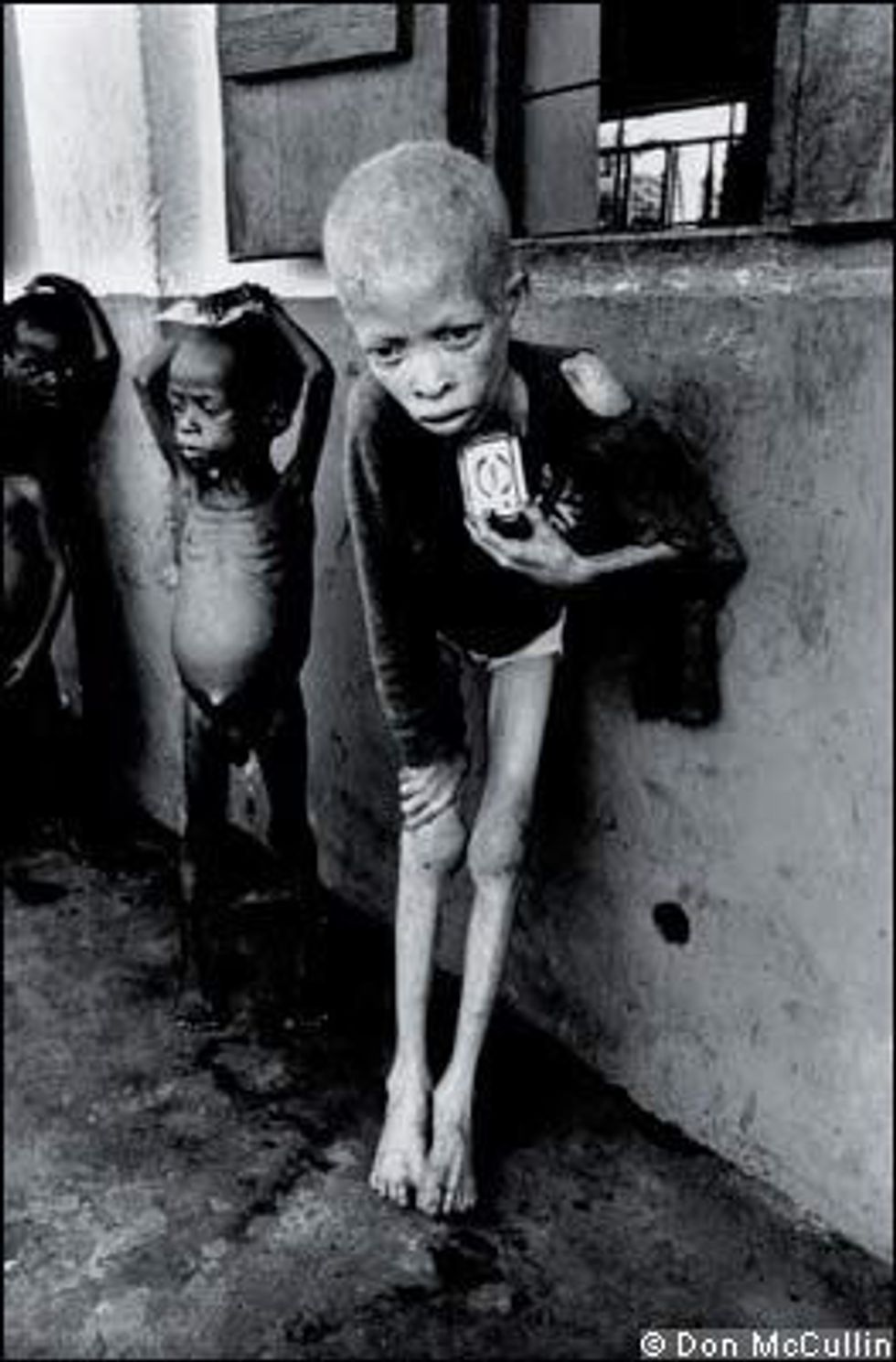 Today, many people probably have never even heard of the Biafra War. (To be honest, I hadn't either until recently.) The war was incited when the people in the Biafra region declared their independence from Nigeria. Nigeria refused this secession and implemented a blockade of food and supplies to the Biafra region. Approximately three million civilians, many of them children, died from fighting and starvation. This photo, taken by Don McCullin, brought the world's attention to the huge suffering the Biafra War was causing children. The starving boy with stick-thin limbs doesn't even have the energy to stand straight. Don McCullin used this photo to bring attention to the Biafra War. Photographs like this made Biafra the world's first media famine.(Time100Photos)