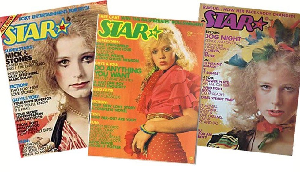 Shray Mecham was the first cover girl for Star. The magazine described the 15-year-old from San Francisco as "foxy," and covered Shray and her friends Sable Starr and Queenie Glam (presumably not their real names) in an article called "Sunset Strip Groupies: Who, What, When & How (Wow!)." The girls can't hide their youth, even under pounds of makeup, silver lame hot pants and 6-inch platforms. There are some pretty cringe-worthy quotes. Take, for instance, Queenie expounding on the importance of connections if you want to meet your favorite rock star: "Even if the guy is 120 years old you have to be kissie with him 'cause he might make good connections for you." Yikes.