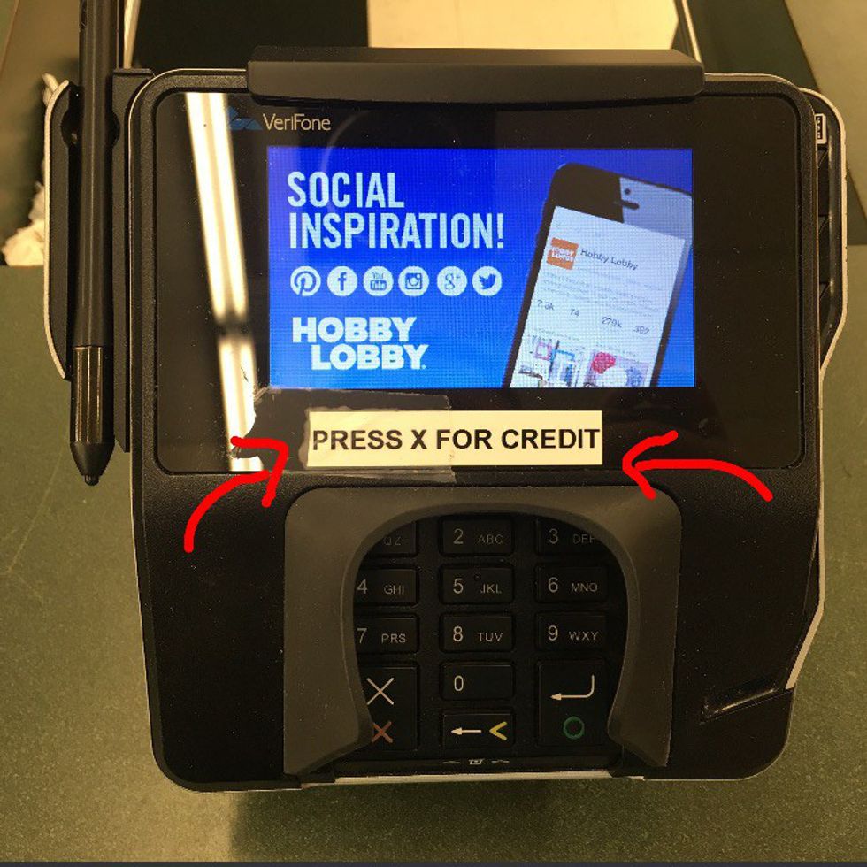 Things we actually say: “Oh sorry about that, you’ll just have to push the red X in the bottom left hand corner of the pinpad to run your card as credit.”