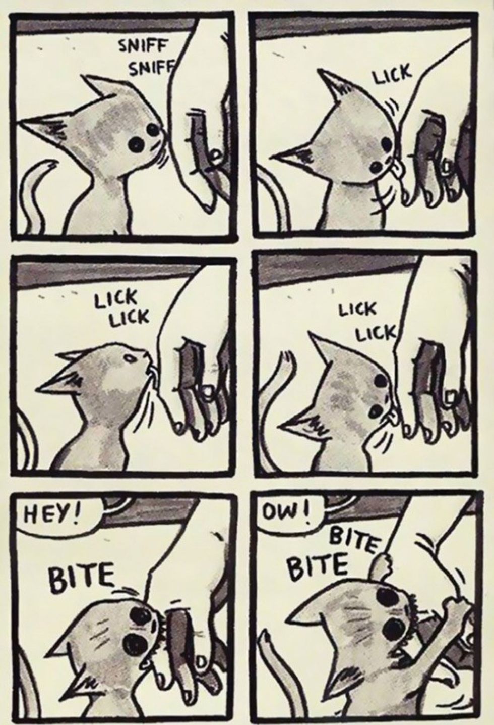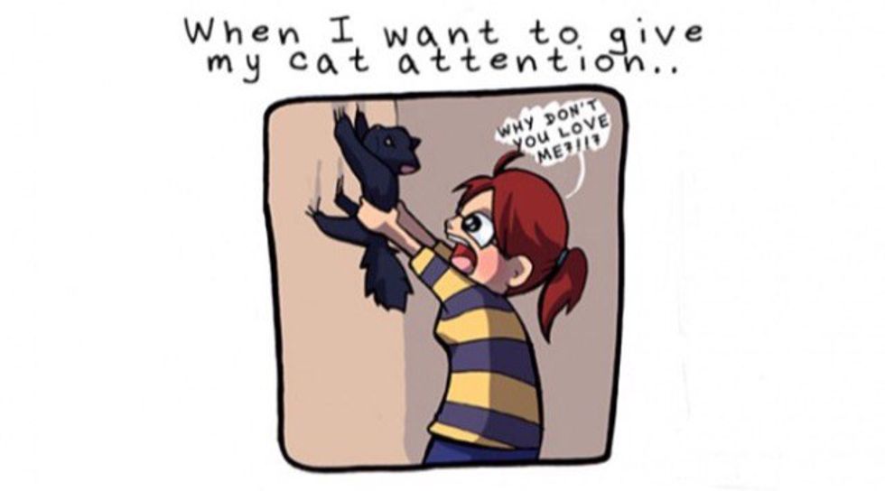 -I tell everyone that I think my cat is "perfect", "precious", "so schweet", and "pretty" BECAUSE SHE IS (kind of). No one agrees with me. She's perfect in my eyes because she's my fur baby. I don't go around telling y'all that y'all's babies aren't perfect, so don't be rude to me or the rest of the cat lady society... Okay maybe she's not the "schweetest" (as you look at the scratches covering my arms and legs from her sneaky ninja attacks when she jumps out of the black abyss aka out from under the couch). It also happens like this...