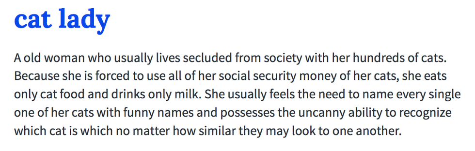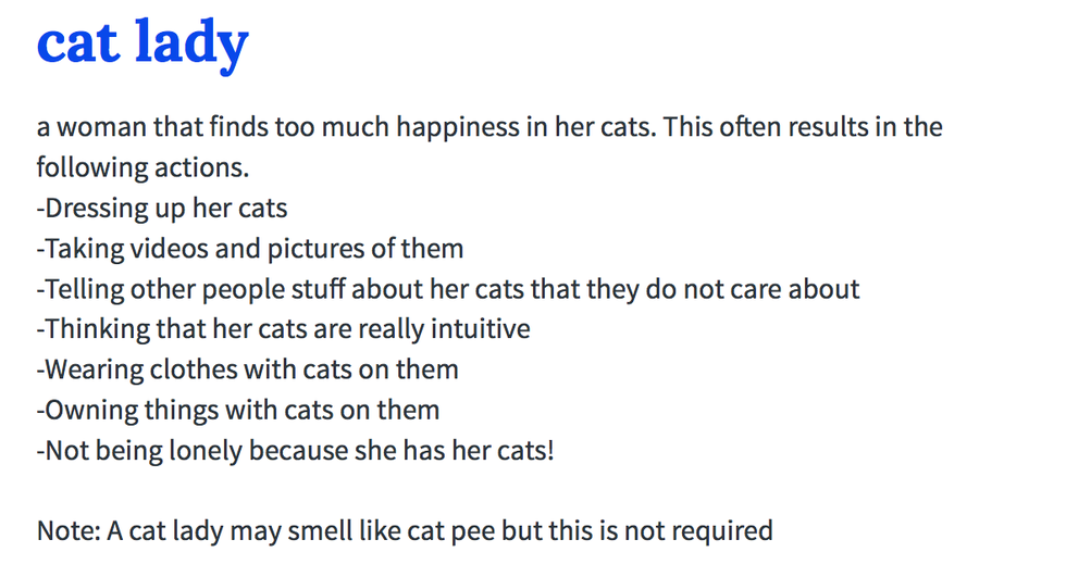 This was the #1 definition in Urban Dictionary and I laughed pretty hard. Not only is it funny, but it is exactly what I think of when I hear "cat lady". This particular definition doesn't really fit me though (maybe 20 years from now). So I kept looking. I then came across this definition:
