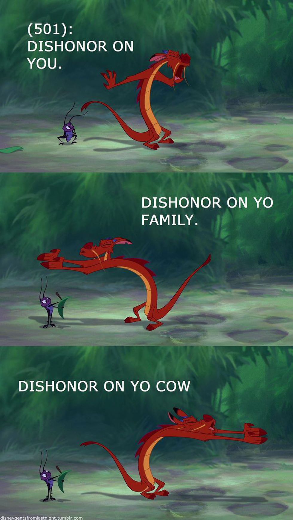 Mushu, "We're gonna die! We're gonna die! We're definitely gonna die! No way we survive this! Death is coming!"