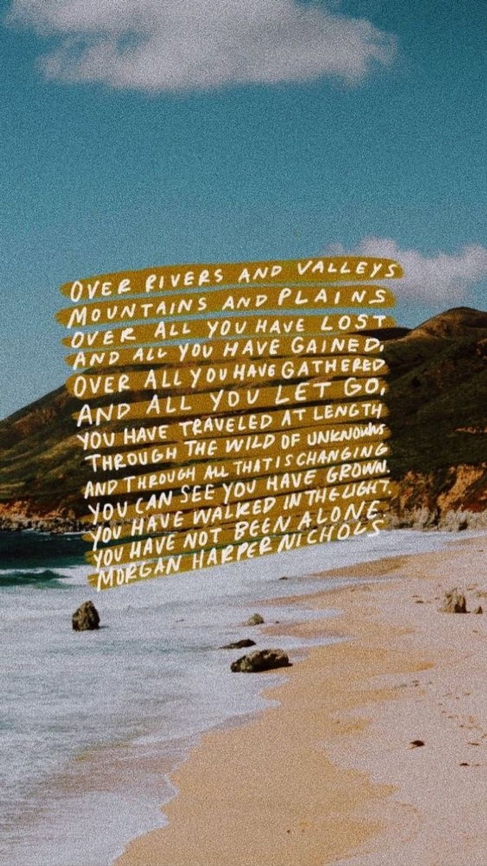 10. "Over rivers and valleys, mountains and plains, over all you have lost and all you have gained, over all you have gathered and all you let go, you have traveled at length through the wild of unknowns and through all that is changing you can see you have grown. You have walked in the light. You have not been alone." -Morgan Harper Nichols