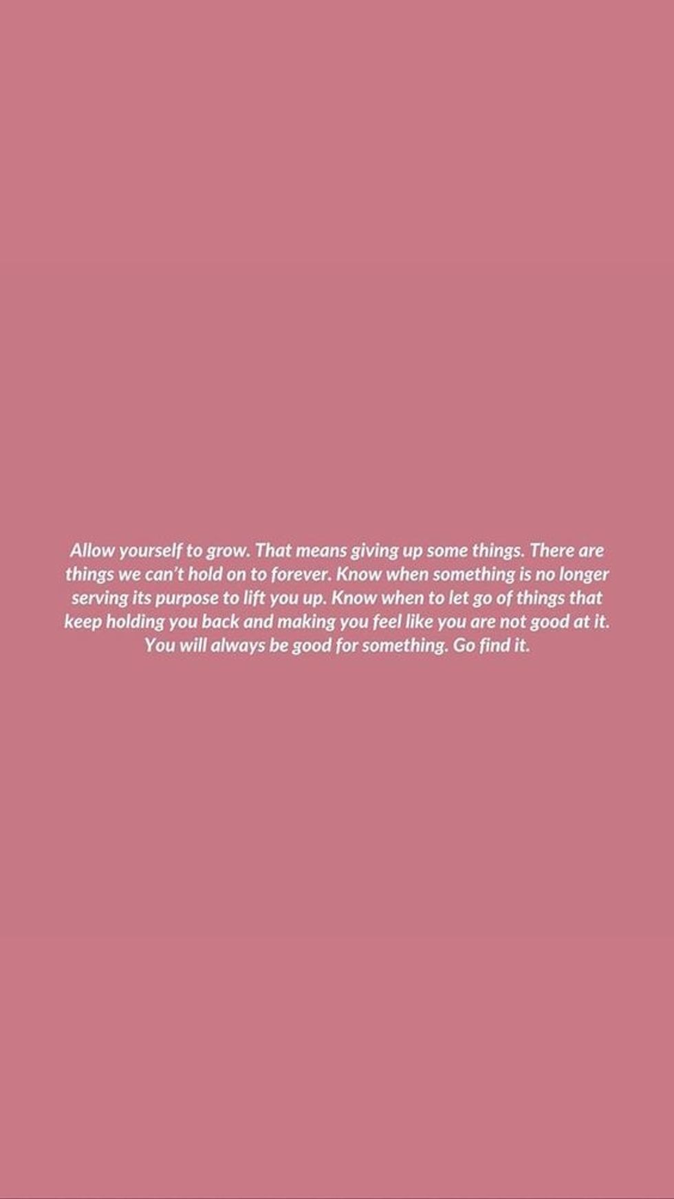 9. "Allow yourself to grow. That means giving up some things. There are things we can't hold on to forever. Know when something is no longer serving its purpose to lift you up. Know when to let go of things that keep holding you back and making you feel like you are not good at it. You will always be good for something. Go find it."