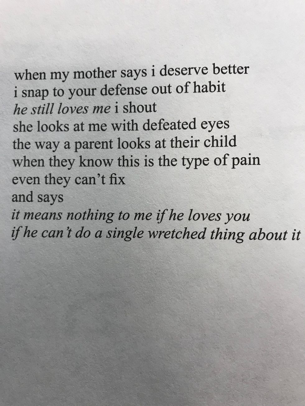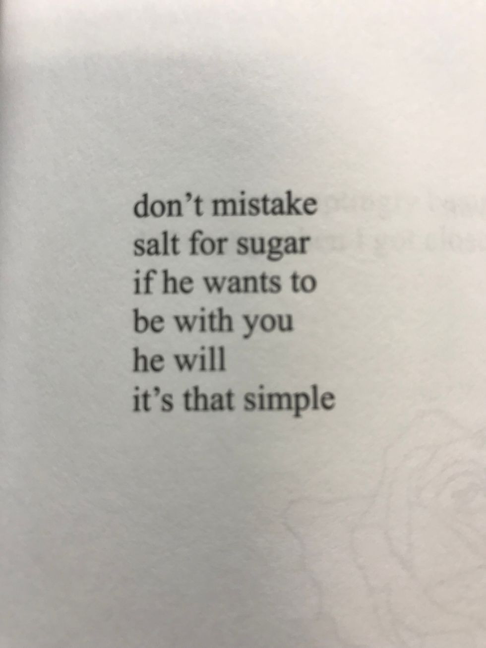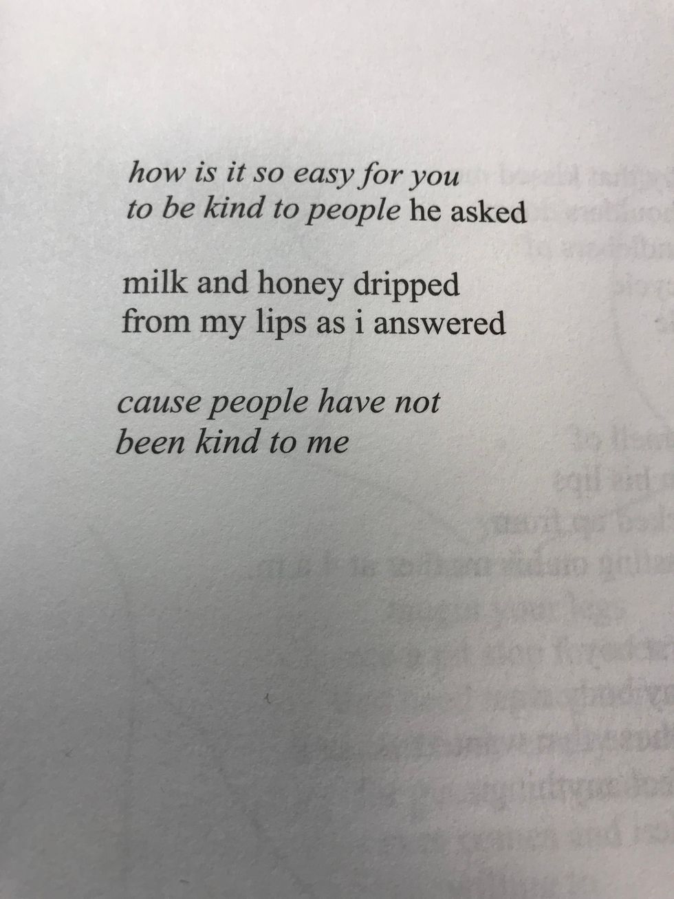 Milk and Honey is a poem book by Rupi Kaur. There are poems in this book that are powerful and inspiring. I have been having some down days lately and this book has helped me. Hopefully it can help others too. These are some of my favorites and what I think the meaning may be.