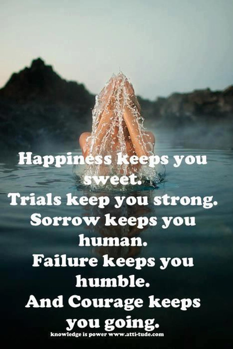 "Happiness keeps you sweet. Trials Keep you strong. Sorrow keeps you human. Failure keeps you humble. And courage keeps you going."