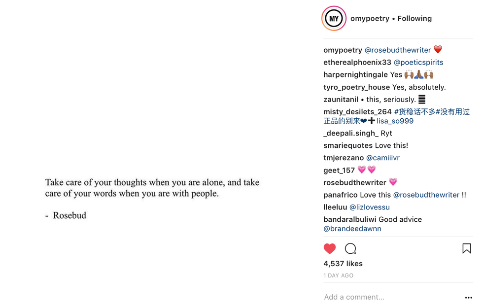 A poetry and quote account, Omypoetry is filled with beautiful words and wisdom. If you want something wonderful to add to your feed I highly recommend a follow.