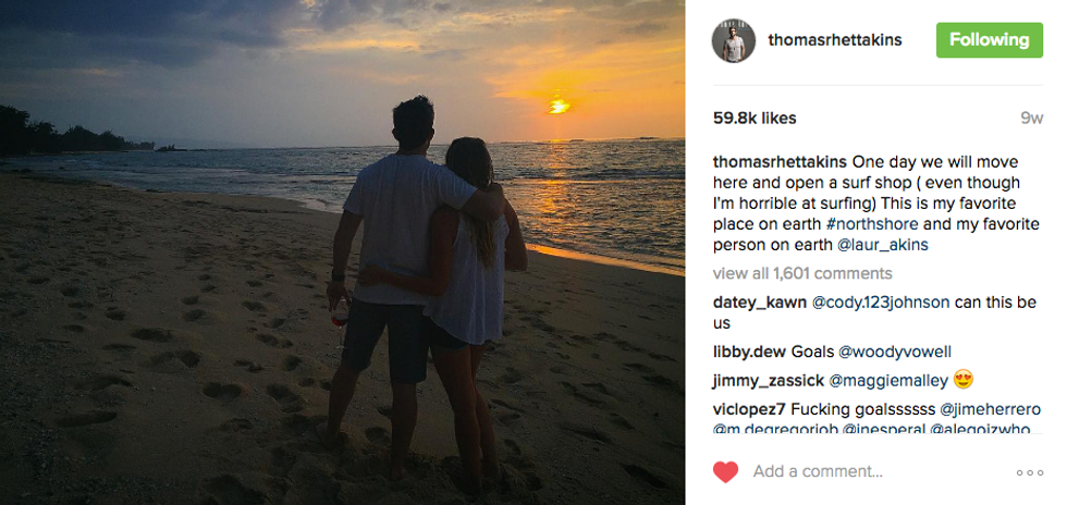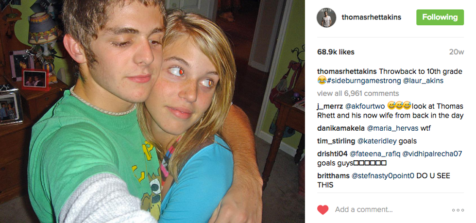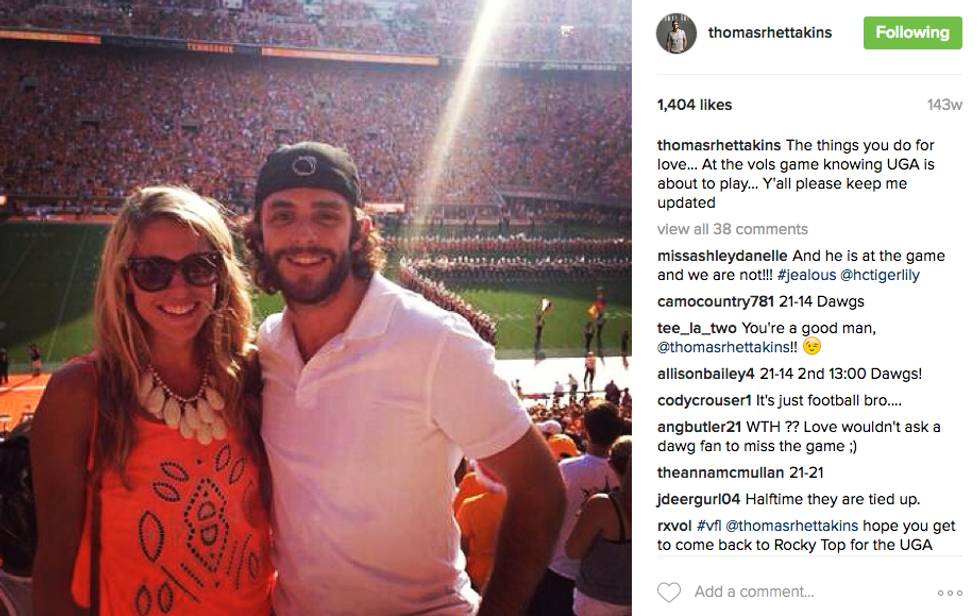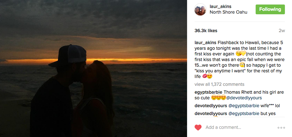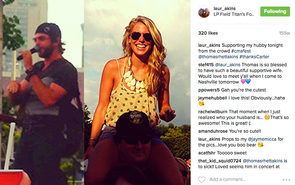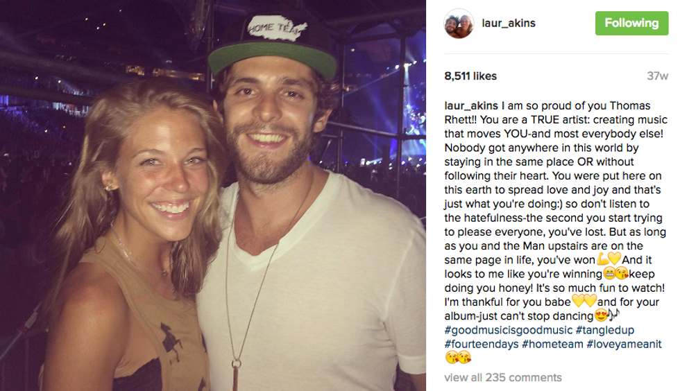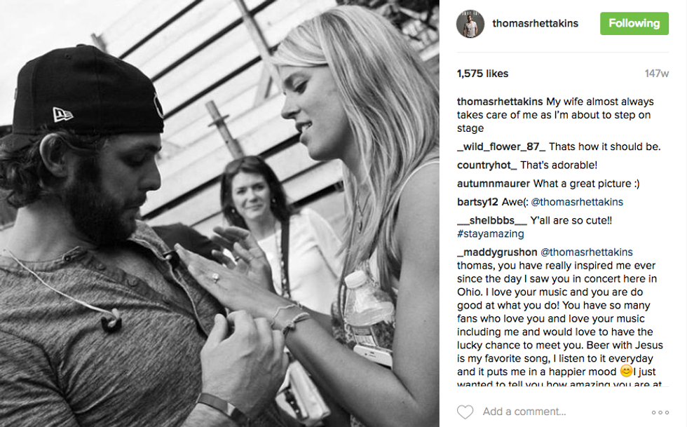 If you are a fan of country music then you definitely have heard of Thomas Rhett and it is more than likely that you have heard of his wife Lauren too. Country fans all over the world have fallen in love with the couple more and more as time has gone on. Just when we all thought that we could not love the two even more, the couple does something to increase our adoration for them. Whether it is putting Lauren in Rhett's music video, releasing their wedding trailer, making a video about their love story, posting a sweet Instagram/tweet, or just simply supporting one another - the two always find a way to exemplify #relationshipgoals. Because I personally adore the two and their relationship, I have creeped hardcore on each of their Instagram accounts and fallen even more in love with them as I get further and further along. Below are just some of the couple's posts about one another that will make you tear up because they are just so perfect together.