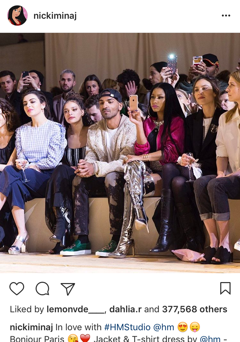 On March 1st, Nicki was spotted in the front row of the H&M Studio show wearing a hot pink H&M jacket and T-shirt dress. Her reflective Balenciaga over the knee boots gave the look a flawless finish.
