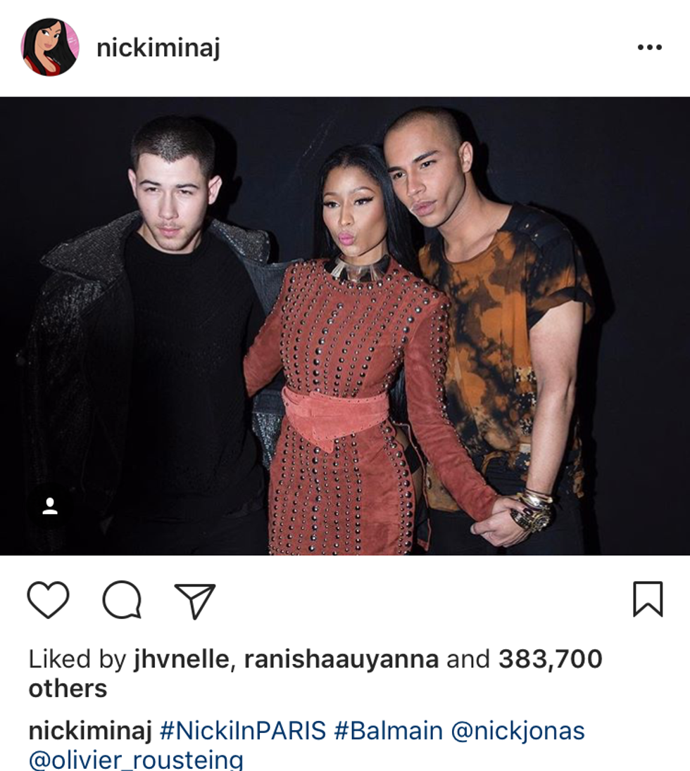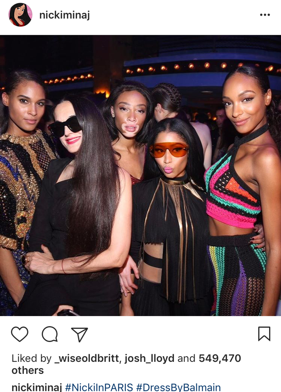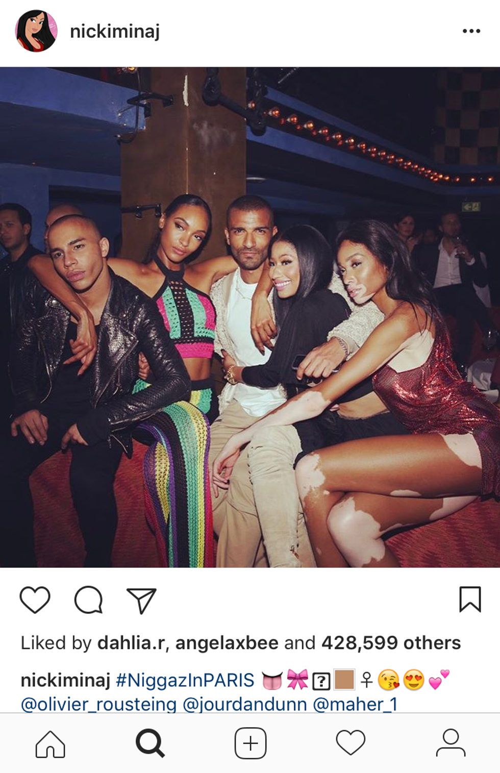 That night Nicki went toned it down for the Balmain after party and danced the night away with celebrities including Winne Harlow, Jourdan Dunn, Maher Jridi and Olivier Rousteing.