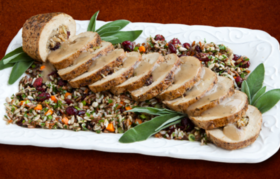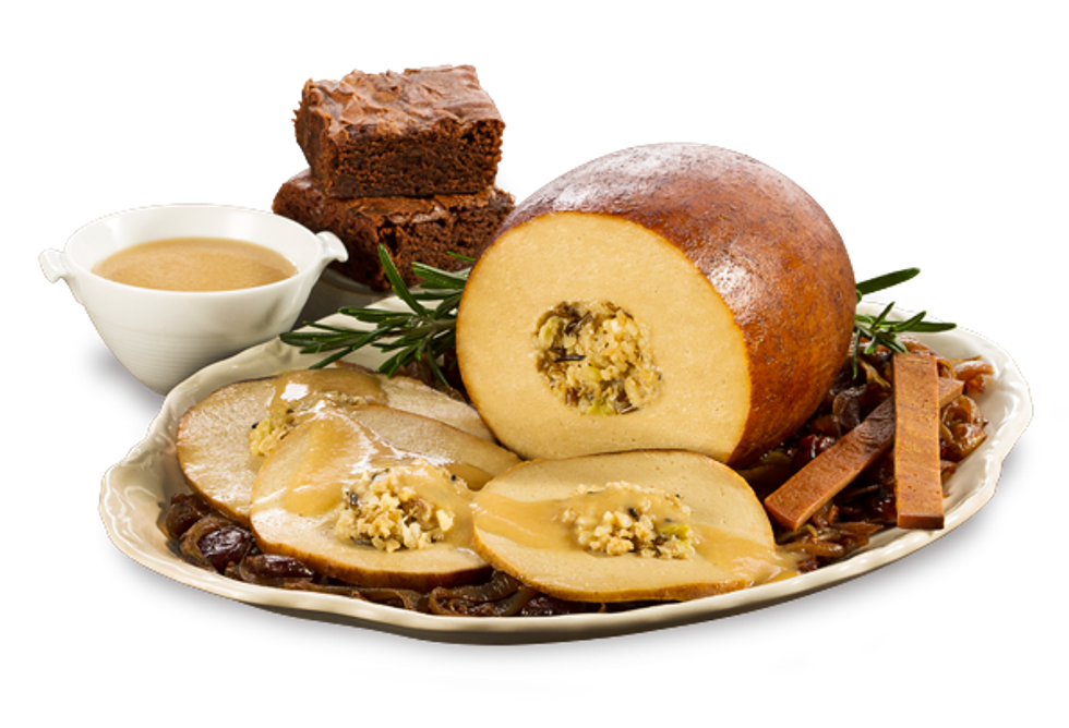Tofurky is probably one of the most successful faux meat brands on the market, and they sell deli slices, sausage links, pizza, and hot pockets to name a few. But their holiday products are where they really shine. You can get the roast on its own (made out of vital wheat gluten and tofu), or get the Thanksgiving Feast, which comes with the roast, gravy, “wishbone jerky,” and a moist and delicious fudge brownie. Since 1995, it’s been the classic.