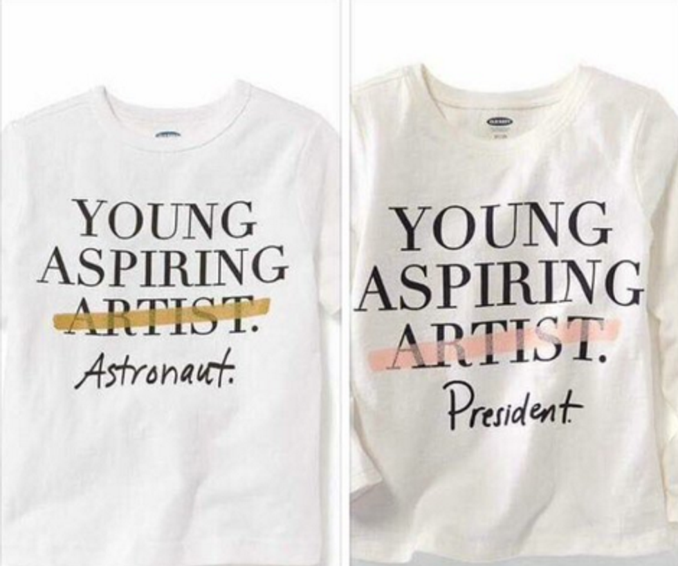 Then we have Old Navy who ran two designs marketed for children and infants that says, "Young Aspiring Artist" but artist is crossed out and replaced with "Astronaut."