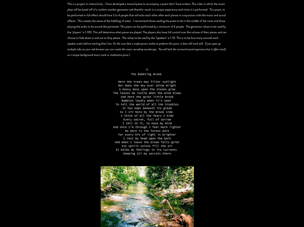 I decided to take a linear story and add an interactive element to the delivery of the piece. My original piece was a poem called The Babbling Brook. By adding music, sound effects, and a set of detailed performance instructions, I was able to change a fixed poem into an experience that would be different each time it is performed. The piece requires a handful of people but can support up to a whole classroom full of participants. The poem is to be read in a way similar to a round. A group of speakers narrates the poem; each following whoever is first. A random number generator determines the length between who starts the next line. The music and SFX aspect can be performed by any number of people who will act as the ‘musicians’ of the piece. Everyone is assigned a track. A random number generator assigns everyone a specific track to play. The musician has full control over how the volume of the track should flow as well as when it should start and stop. The fact that the same tracks can play over each other and happen together ensures that each performance will sound different. There exists the possibility that 5 of the same track can play at the same time. In the future, I would like to expand this project to having a line shuffler to the poem so it can be read in random order. I would also like to add another 10 tracks to add to the variation of the performance.
