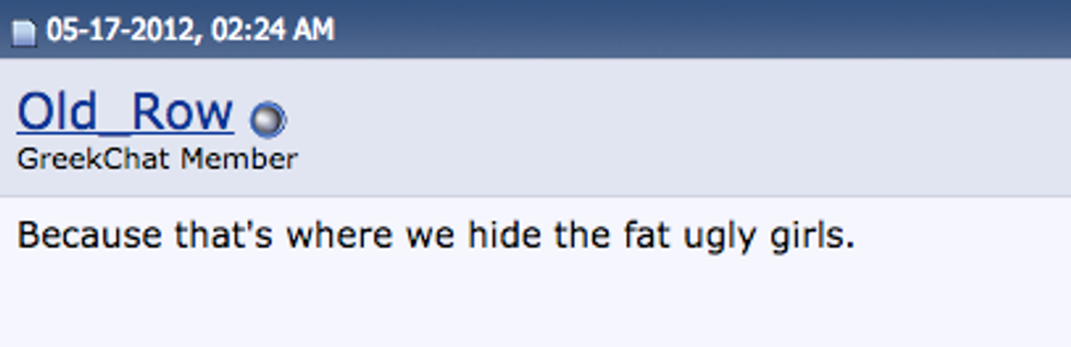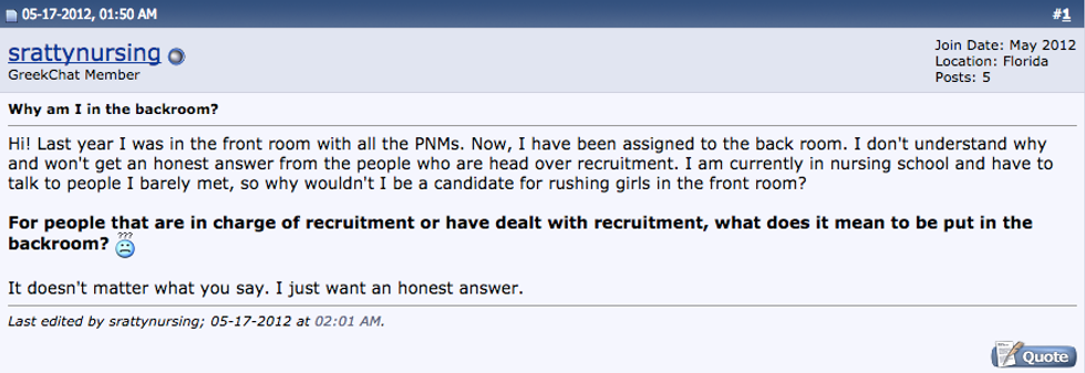 "Pam*, was recruiting a PNM (Potential New Member) during a "party" (an allotted amount of time split between different sororities where these PNMs come and meet the sisters of each house) and they were hitting it off—that is, until the PNM took notice of a girl, Josie*, sitting in the corner of the room, playing music for the party. Josie* was working what we call the 'backroom,' aka she runs the ins and outs of recruitment: music, lighting, etc. The PNM–clearly unaware of the roles sisters play during recruitment–asked Pam* if Josie* was also a sister. Pam* took one look over at Josie*, who was overweight and rocking a t-shirt, (which already separated her from the flock of black and gold dresses everyone else was wearing for the party) and responded with, 'No. We just hired her for recruitment.'"