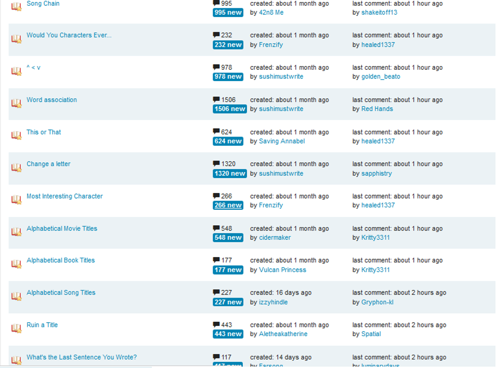 - NaNoWriMo This one is seasonal. Check out camps in the spring/summer or National Novel Writing Month in November. If you miss those months, check it out anyway. The forums are full of writing games that you can join if you’ve ever had a hankering to write stories. Maybe consider being a part of one of the events once you get to know the site.