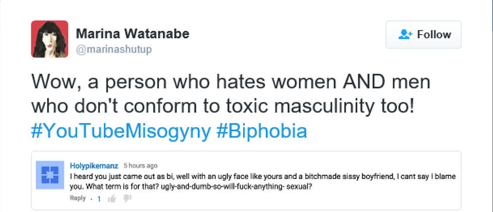 Another prime example of internet hate is the misogynistic comments that constantly get left for Marina Wantanabe, also known as @marinashutup on YouTube and other social media. The YouTuber has a very strong feminist influence on her channel, and has used the hashtag #youtubemisogyny on Twitter to share her experiences with internet hate. People constantly comment on her on Instagram, YouTube, and Twitter about her sexuality, her beliefs, her looks, and so on. Of course she gets backlash for taking a stand, but she is showing people how awful the hate can get.