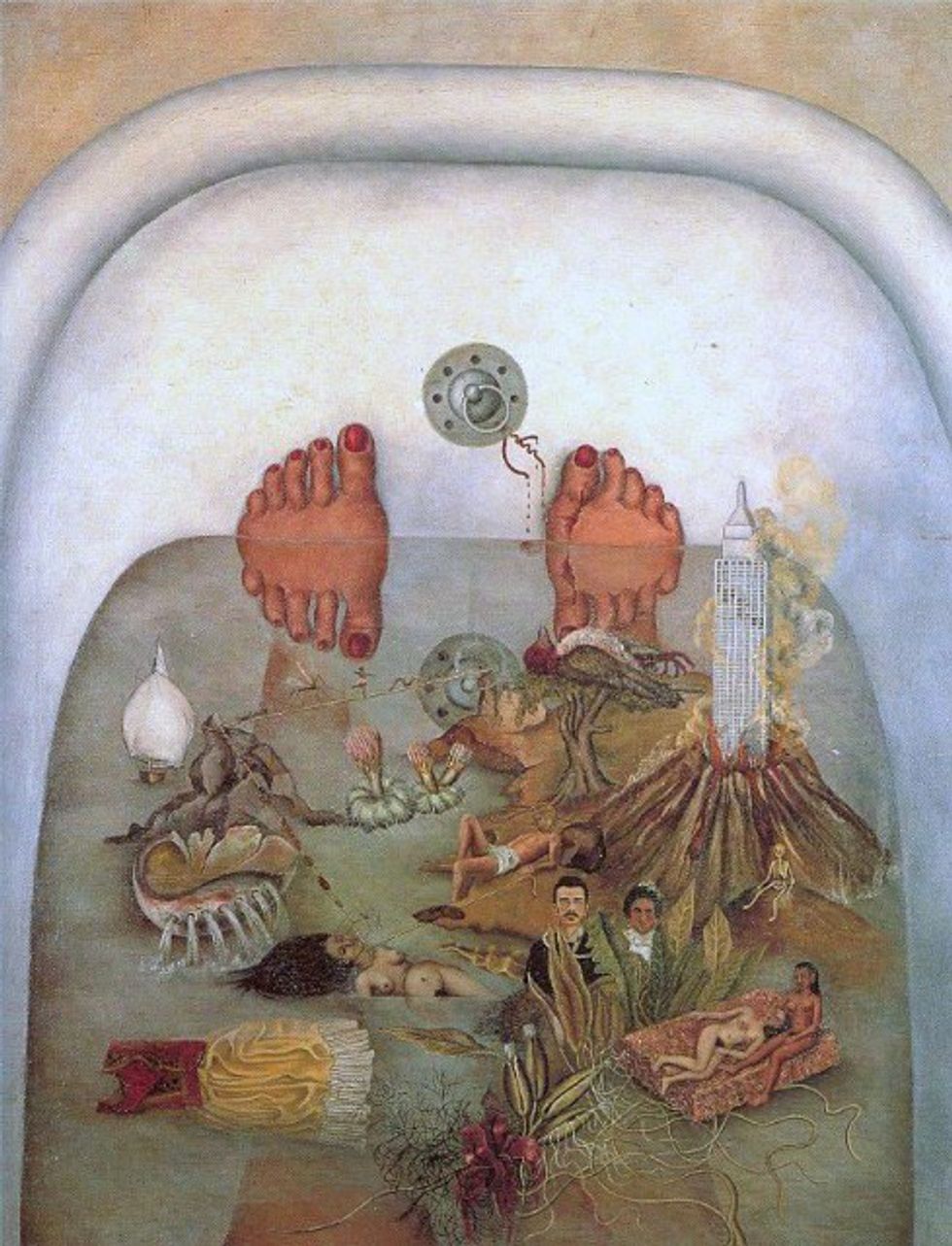 Pain and nationalism are not the only thoughts and feelings present either, but are the fuel to the fire that led to her political beliefs and turn towards communism. In Kahlo’s painting, What the Water Gave Me (1938), painful, personal, cultural, and political thoughts are present, yet are each interconnected in a way that one set back was the result of another and all thoughts are living together in the tub with her.
